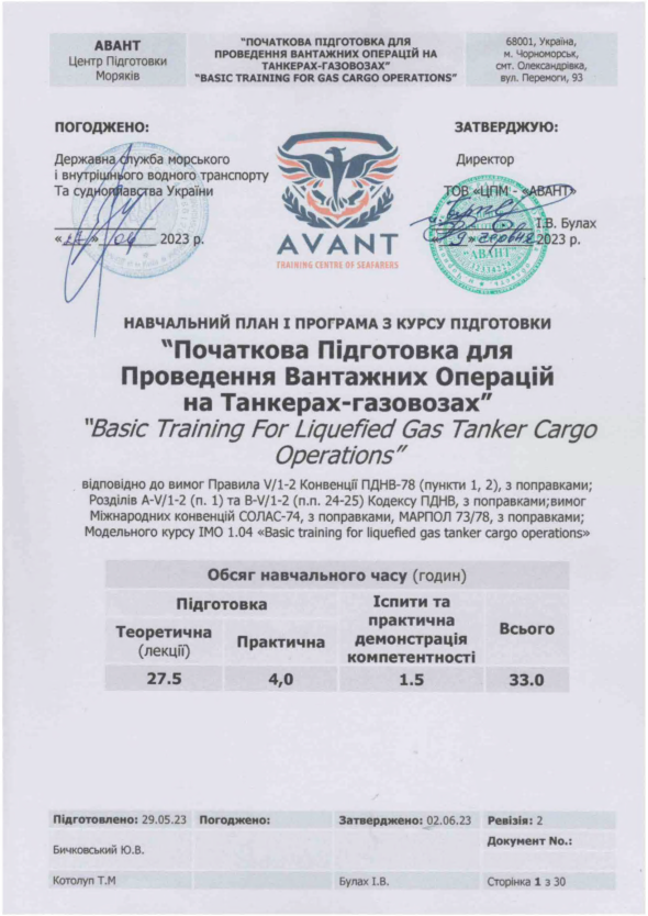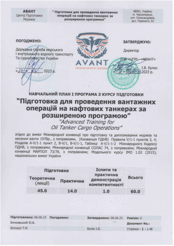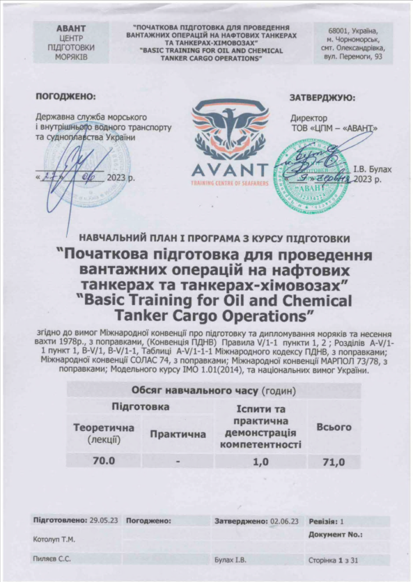 Базова підготовка з перевезення вантажів на нафтових та хімічних танкерах Операції