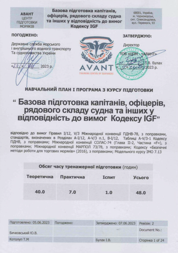 Базова підготовка капітанів, офіцерів, рядового складу судна та інших офіцерів судна відповідно до вимог Кодексу IGF