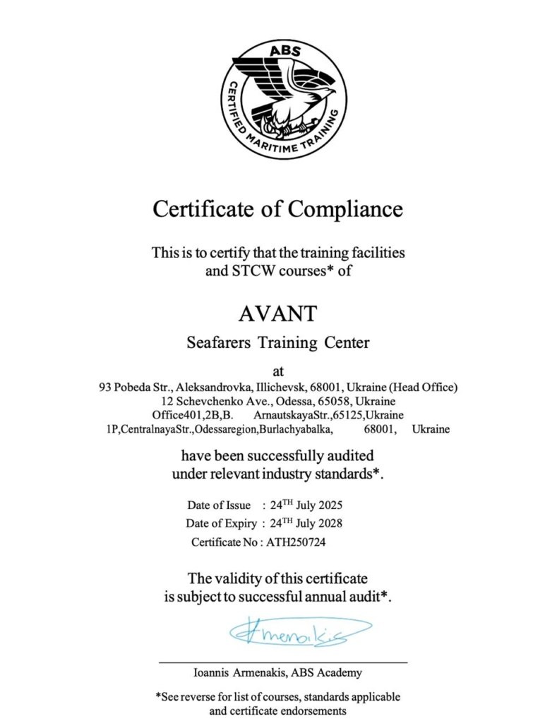 TCS AVANT | Certificate of Compliance (ABS) | Valid until 24/07/2028